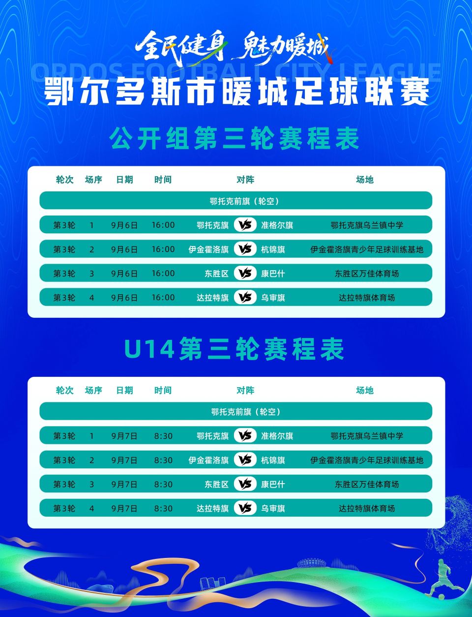 比赛场地:鄂托克旗乌兰镇中学、伊金霍洛旗青少年足球训练基地、东胜区万佳体育场、达拉特旗体育场